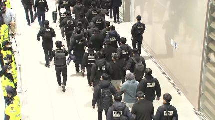 경찰관들에게 양팔을 붙잡힌 채 고개를 푹 숙이고, 입국장을 줄지어 빠져나갑니다.