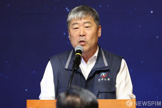 [서울=뉴스핌] 정일구 기자 = 김동명 한국노총 위원장이 지난달 15일 오전 서울 여의도 국회 사랑재에서 열린 국회 사회적 대화 공동 선언식에서 인사말을 하고 있다. 2025.10.15 mironj19@newspim.com |