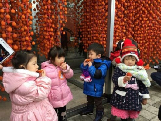 어린이들이 곶감축제장에서 곶감을 먹고 있다/블로그 |