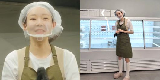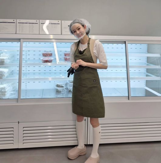사진 속 지연수는 위생모를 쓰고 앞치마를 두른 채 반찬 가게 앞에서 포즈를 취하고 있다.