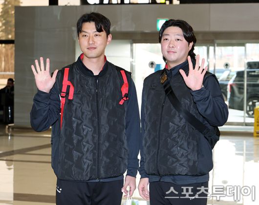 [김포공항=스포츠투데이 권광일 기자] KIA 홍건희, 김범수가 23일 2026 시즌 준비 스프링캠프를 위해 23일 김포국제공항에서 출국 전 기념촬영을 하고 있다. 2026.01.23. [스포츠투데이 권광일 기자 sports@stoo.com]