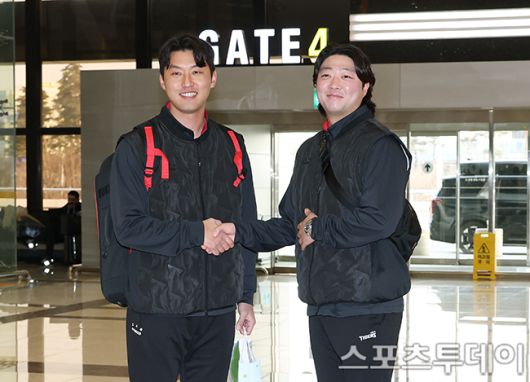 [김포공항=스포츠투데이 권광일 기자] KIA 홍건희, 김범수가 23일 2026 시즌 준비 스프링캠프를 위해 23일 김포국제공항에서 출국 전 기념촬영을 하고 있다. 2026.01.23. [스포츠투데이 권광일 기자 sports@stoo.com]