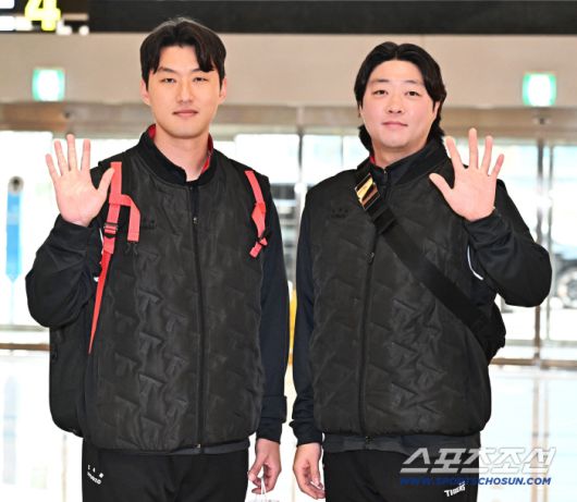 23일 오후 KIA 타이거즈 선수단이 김포공항을 통해 전지훈련이 열리는 일본으로 출국했다. 함께 포즈를 취하고 있는 KIA 홍건희, 김범수. 김포공항=송정헌 기자songs@sportschosun.com/2026.01.23/