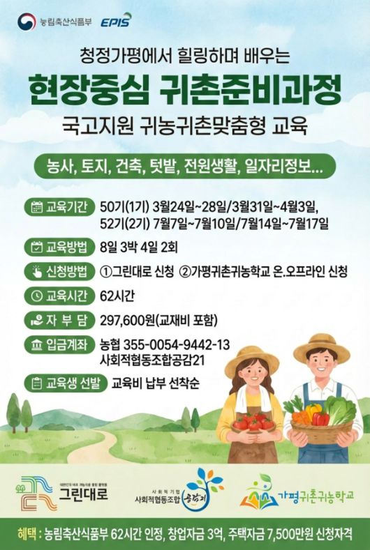 신청은 귀농·귀촌 통합 플랫폼 '그린대로'를 통한 온라인 접수 또는 가평귀촌귀농학교 방문을 통한 오프라인 접수로 가능하다. 교육비는 교재비 포함 297,600원이며, 교육생은 교육비 납부 선착순으로 선발된다.