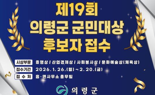(의령=국제뉴스) 황재윤 기자 = 의령군은 오는 26일부터 2월 20일까지 2026년 의령군 군민대상 후보자 추천 접수를 한다고 밝혔다.