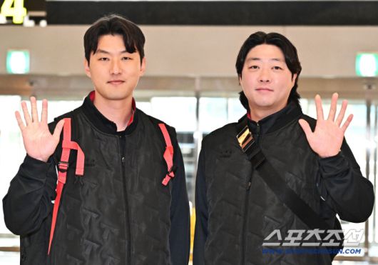 23일 오후 KIA 타이거즈 선수단이 김포공항을 통해 전지훈련이 열리는 일본으로 출국했다. 함께 포즈를 취하고 있는 KIA 홍건희, 김범수. 김포공항=송정헌 기자songs@sportschosun.com/2026.01.23/