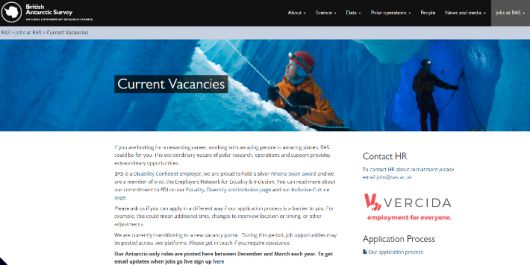 영국 남극조사단 홈페이지(bas.ac.uk) 구인광고 화면 캡처 |