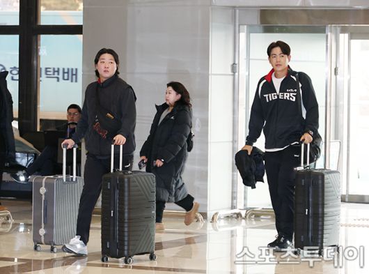 [김포공항=스포츠투데이 권광일 기자] KIA 김범수, 이태양이 23일 2026 시즌 준비 스프링캠프를 위해 23일 김포국제공항에서 출국을 준비하고 있다. 2026.01.23. [스포츠투데이 권광일 기자 sports@stoo.com]