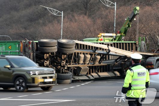 (대구=뉴스1) 공정식 기자 = 23일 오후 2시 6분쯤 대구 수성구 범안삼거리에서 25톤 트레일러가 전도되면서 태양광 패널 등이 실린 20여 톤짜리 컨테이너가 적재함에서 떨어지는 사고가 발생해 경찰이 사고 현장을 수습하고 있다. 경찰은 안심 방면에서 수성나들목(IC)으로 향하던 트레일러가 좌회전 도중 무게 중심을 잃어 전도된 것으로 보고, 정확한 사고 경위를 조사하고 있다. 2026.1.23/뉴스1