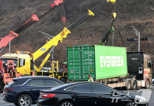 (대구=뉴스1) 공정식 기자 = 23일 오후 2시 6분쯤 대구 수성구 범안삼거리에서 25톤 트레일러가 전도되면서 태양광 패널 등이 실린 20여 톤짜리 컨테이너가 적재함에서 떨어져 2시간 넘게 사고 수습이 진행되고 있다. 2026.1.23/뉴스1