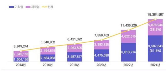 조사 결과, 국내 대중문화예술산업 매출 규모는 15조3845억원으로 2022년 11조4362억원 대비 34.5% 급성장했다. 이는 조사가 처음 시작된 2015년 이래 역대 최고 기록이다. 34.5%의 성장률 역시 역대 최고다.