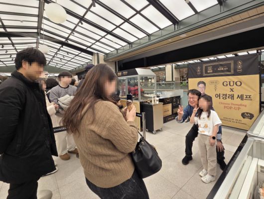 [대전=뉴스핌] 오영균 기자 = 대전신세계 Art&Science(대전신세계)는 지하 1층 식품 행사장에서 다음달 1일까지 흑백요리사1 출신 중식 대가 여경래 셰프와 협업한 '구오 만두' 팝업을 진행한다고 23일 밝혔다. 이번 팝업에서는 시그니처 메뉴인 고추잡채 생전포와 베스트 메뉴인 모자새우 만두, 사천군만두 등을 맛볼 수 있다. 사진은 23일 팝업을 방문한 여경래 셰프가 시민들과 사진을 찍고 있는 모습. [사진=대전신세계] gyun507@newspim.com