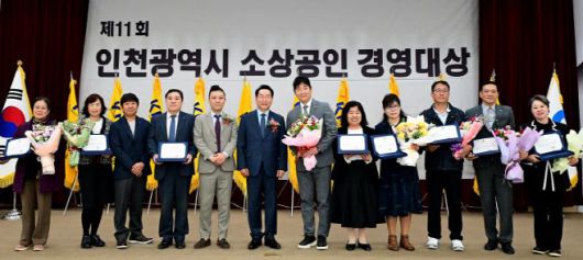 유정복 인천시장(좌측 6번째)이 지난해 10월 시청 대회의실에서 열린 '제11회 인천광역시 소상공인 경영대상'에서 수상자들과 기념촬영을 하고 있다. |