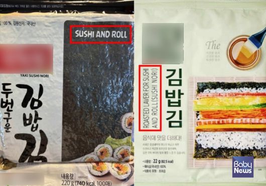 일부 '김밥용 김’ 제품의 포장지에 영어로 '스시 앤 롤(SUSHI AND ROLL)’이라고 표기된 사례가 여전히 남아 있어 논란이 되고 있다.