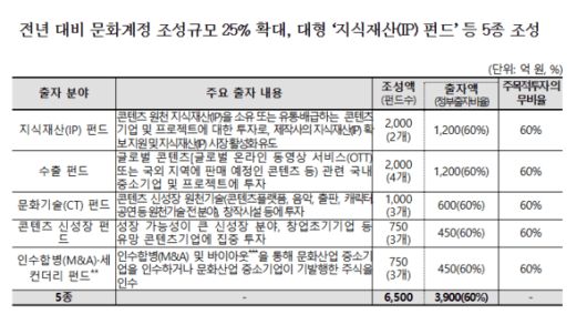 지식재산 · 수출 · 문화기술 펀드가 속한 문화 계정은 전년대비 25% 증가한 6500억원이 편성됐다. 문화부의 출자 규모는 60%로 지난해 3000억원에서 3900억원으로 늘어났다.