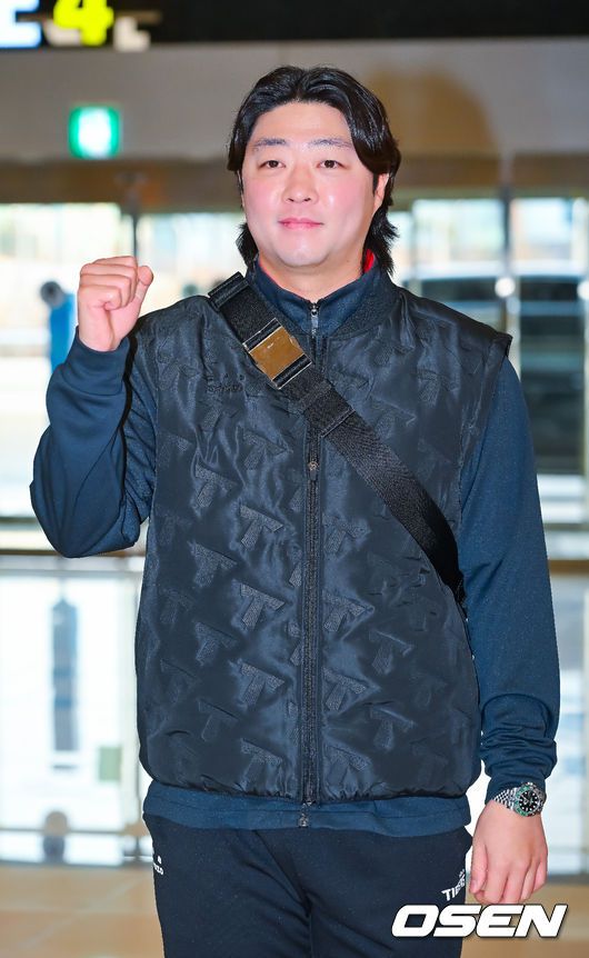 [OSEN=김포공항, 민경훈 기자] 2026시즌 스프링캠프 나서는 KIA 코칭스태프와 외국인 선수들이 23일 김포국제공항을 통해 일본 아마미오시마로 출국했다. 지난해 미국 캘리포니아 어바인에서 훈련했던 KIA는 일본 가고시마현의 외딴섬인 아마미오시마로 1차 훈련지로 정했다. KIA 김범수가 포즈를 취하고 있다. 2026.01.23 / rumi@osen.co.kr