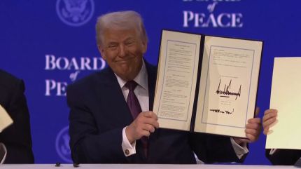 트럼프 미국 대통령이 다보스 포럼 행사장에 모인 각국 정상과 관료들 앞에서 가자지구 평화위원회 헌장에 서명합니다.