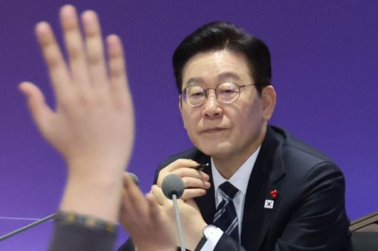 이재명 대통령이 23일 울산전시컨벤션센터에서 열린 '울산의 마음을 듣다' 타운홀미팅 간담회에서 발언권을 요청하는 참석자들을 바라보고 있다. 연합뉴스 |