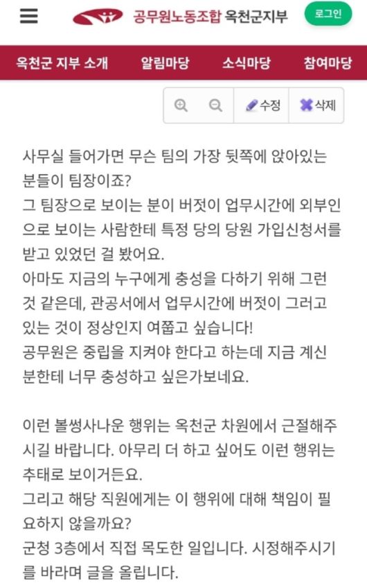 옥천군청 공무원이 근무 시간에 군청 안에서 특정 정당 입당원서를 받았다는 글이 등장해 군청이 자체 조사에 착수했다.