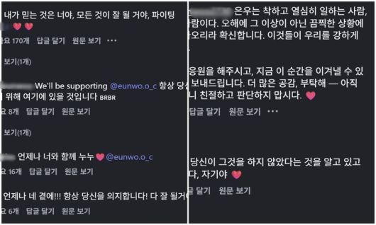 해외 팬들은 "내가 믿는 것은 너야, 모든 것이 잘 될거야 파이팅", "항상 당신을 지원하기 위해 여기에 있을 것입니다", "언제와 은우와 함께", "은우는 착하고 열심히 일하는 사람", "끔찍한 상황에서 그가 다치지 않기를", "은우 오빠 믿어요", "은우 사랑해" 등 다양한 언어를 사용해가며 차은우의 앞날을 응원했다.
