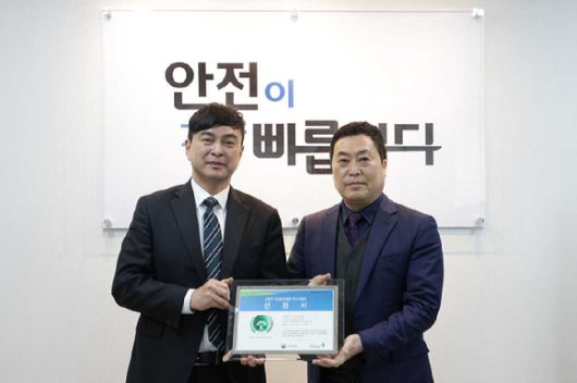 23일 오전 서울 영등포구 안전보건공단 서울남부지사에서 진행된 근로자 건강증진활동 우수사업장 선정서를 수여식에서 김중혁 태광그룹 레저·인프라 계열사 티시스 CS사업본부장(우)과 한국산업안전보건공단 이윤규 남부지사장이 기념촬영 하는 모습. [사진=태광] |