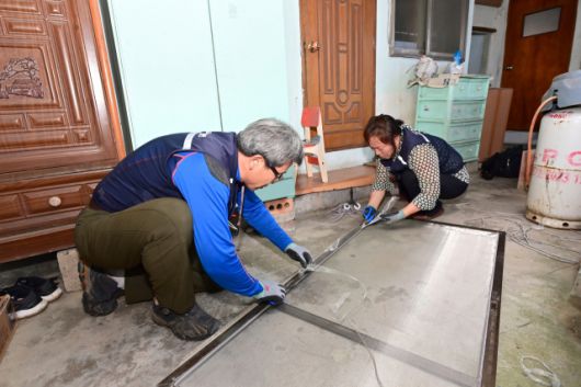▲청송군 의 효자손인 ‘8282 민원처리반이 노인 가구에서 방충방 을 교체하고 있다ⓒ청송군청 |
