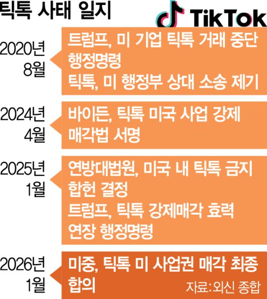 틱톡 갈등의 시작은 트럼프 1기 행정부 시절인 2019년으로 거슬러 올라간다. 미 재무부 산하 외국인투자심의위원회(CFIUS)가 안보 위협을 이유로 이미 2년 전 끝난 틱톡의 뮤지컬리 인수 조사에 나선 것이 발단이다. 이후 트럼프 대통령이 틱톡 거래를 금지하는 행정명령에 서명했지만 법원이 틱톡이 제기한 효력 정지 가처분 신청을 받아들였고 정권을 넘겨받은 조 바이든 대통령은 행정명령을 폐기했다. 하지만 2024년 4월 미 의회에서 틱톡의 미국 사업을 270일 안에 매각하지 않으면 퇴출시키는 법안이 통과되고 바이든 대통령이 법안에 서명하면서 갈등이 다시 고조됐다. 애초 매각 시한은 지난해 1월 19일이었으나 백악관에 돌아온 트럼프 대통령이 시한을 수차례 연장하면서 중국과 마라톤 협상을 벌여왔다.