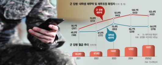 주목할 만한 점은 이 같은 급증세가 군 장병들의 월급이 대폭 인상되기 시작한 2023년 본격화됐다는 것이다. 2021년 60만 8500원이었던 군 장병(병장 기준) 월급은 2023년 100만 원으로 뛰었고 지난해부터 150만 원이 유지되고 있다. 공교롭게도 병사들의 가처분소득이 늘어난 시점에 빚에 허덕이는 젊은 층이 증가한 것이다.