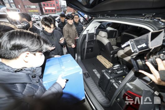 [서울=뉴시스] 김근수 기자 = 23일 오후 서울 동작경찰서에서 서울경찰청 공공범죄수사대 수사관들이 압수물품을 들고 이동하고 있다.
