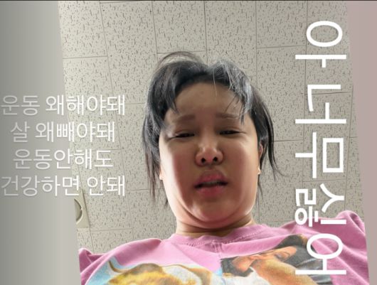 사진에는 "운동 왜 해야 돼", "살 왜 빼야 돼", "운동 안 해도 건강하면 안 돼", "아 너무 싫어"라고 적혀 있어 다이어트를 둘러싼 압박에 대한 피로감을 드러냈다.