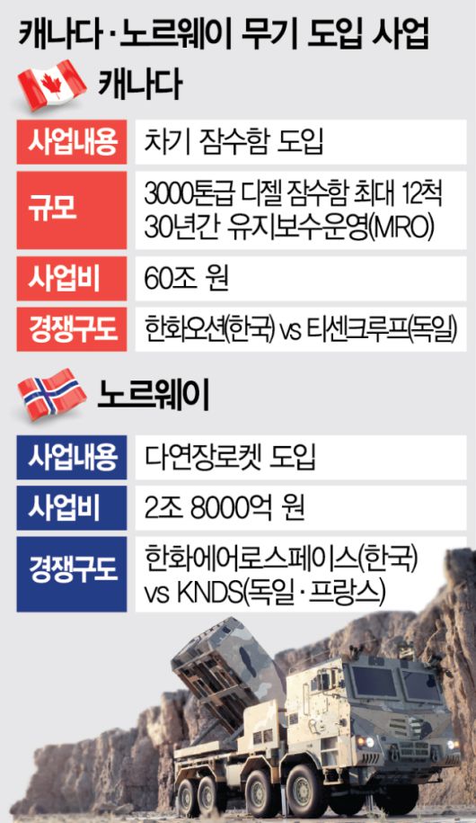 방산 특사단은 캐나다에 이어 노르웨이를 찾는다. 노르웨이는 19억 달러(약 2조 8000억 원) 규모의 다연장로켓 조달 프로젝트를 추진 중인데 한화에어로스페이스(012450)의 ‘천무’가 낙점받을 가능성이 적지 않다. 엔드레 룬데 노르웨이 국방물자청 특별고문은 “(관련 법안이) 27일(현지 시간) 노르웨이 의회에서 본회의 표결에 부쳐질 예정”이라고 밝혔다. 노르웨이 정부는 의회에서 해당 법안이 통과된 후 최종 사업자를 결정할 예정이다.
