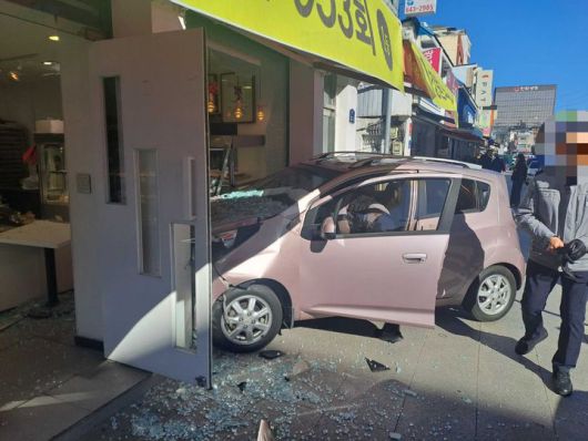 [강릉=뉴시스] 이순철 기자 = 23일 낮 12시 44분께 강원 강릉시 금학동 한 상가로 40대 A씨가 운전하던 경차가 돌진했다.