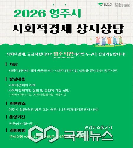(영주=국제뉴스) 백성호 기자 = 영주시와 영주시사회적경제지원센터는 사회적경제에 대한 시민들의 이해를 높이고 신규 사회적경제기업 발굴을 지원하기 위해 '2026 영주시 사회적경제 상시상담'을 연중 운영한다.