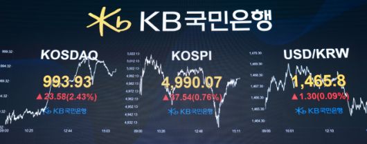 이날 코스피는 한때 5021.13까지 올라 장중 기준 사상 최고치를 경신했지만 차익 실현 매물이 나오면서 상승 폭이 축소돼 전 거래일보다 37.54포인트(0.76%) 오른 4990.07에 거래를 마쳤다. 이틀째 종가 5000 앞에서 물러섰다. 코스닥 지수도 전장보다 23.58포인트(2.43%) 오른 993.93에 장을 마감해 2022년 1월 7일(995.16) 이후 4년여 만에 최고치를 기록했다.