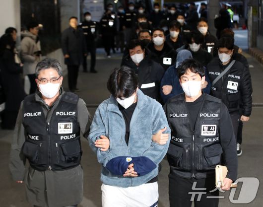 (부산=뉴스1) 윤일지 기자 = 캄보디아에서 대규모 스캠 범죄를 저질러 강제 송환된 한국인 피의자들이 23일 오후 부산 동래구 동래경찰서로 압송되고 있다. 이날 인천국제공항을 통해 강제 송환된 한국인 피의자 73명 중 49명은 부산으로 압송돼 조사를 받는다. 2026.1.23/뉴스1