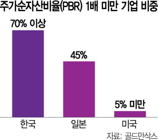 국내 증시는 주가순자산비율(PBR) 1배 미만인 기업 비중이 여전히 70%를 넘는데 미국(5% 미만), 일본(45%) 등과 비교하면 여전히 높은 수준이라는 것이다. PBR 1배 미만은 기업 주가가 장부 가치보다 낮게 거래된다는 의미로 저평가 기준으로 활용된다.