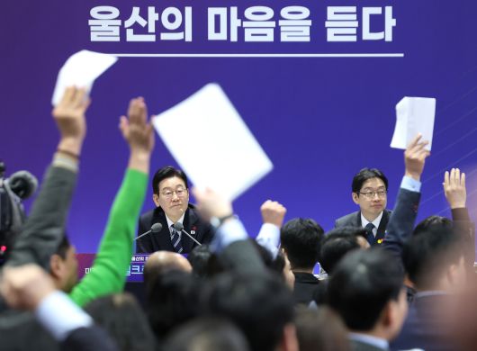 이재명 대통령이 23일 울산전시컨벤션센터에서 열린 ‘울산의 마음을 듣다’ 타운홀미팅 간담회에서 참석자들로부터 발언권 요청을 받고 있다. [연합] |