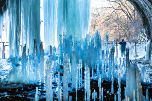 지난 22일 경기 연천군 신서면 경원선 폐터널을 방문한 관광객이 역고드름을 촬영하고 있다./사진=뉴스1 |