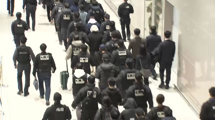 경찰관들에게 양팔을 붙잡힌 채 고개를 푹 숙이고, 입국장을 줄지어 빠져나갑니다.