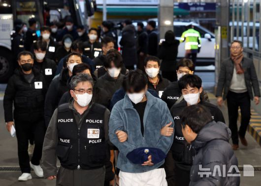 [부산=뉴시스] 하경민 기자 = 캄보디아 범죄단체에 가담한 혐의로 강제송환된 한국인 조직원 일부가 23일 부산 동래구 동래경찰서로 압송되고 있다. 강제송환된 한국인 조직원 73명 중 부산으로 압송된 49명(시하누크빌 조직)은 경찰서 유치장 6곳에 분산 수감돼 조사를 받는다. 2026.01.23. yulnetphoto@newsis.com |