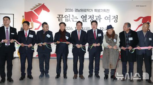 [창원=뉴시스]홍정명 기자 = 경남도는 박완수 지사가 23일 경남문화예술회관 제2전시실에서 열린 '2026 경남원로작가 특별기획전-끝없는 열정과 여정' 개막식에 참석해 원로 작가들에게 깊은 존경과 감사의 뜻을 전했다고 밝혔다.