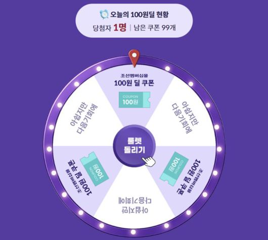 100원딜 쿠폰 수량은 월~목요일 0시마다 초기화합니다. 쿠폰에 당첨되신 분은 매주 금요일 오후 6시까지 쿠폰 사용을 완료해주세요. 기한이 지나면 쿠폰은 자동 소멸합니다. 매일 룰렛을 돌려 소소한 즐거움을 누려보세요.