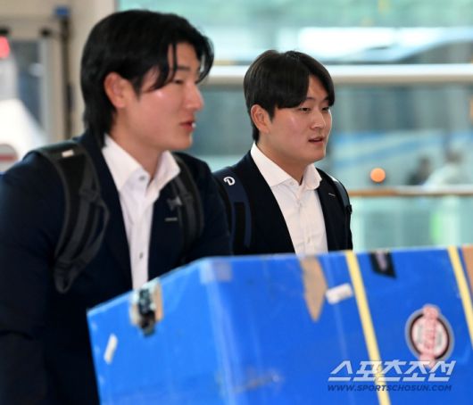 두산 베어스 선수단이 23일 인천공항을 통해 전지훈련지인 호주 시드니로 출국했다. 곽빈과 김택연이 출국장으로 들어서고 있다. 인천공항=허상욱 기자wook@sportschosun.com/2026.01.23/