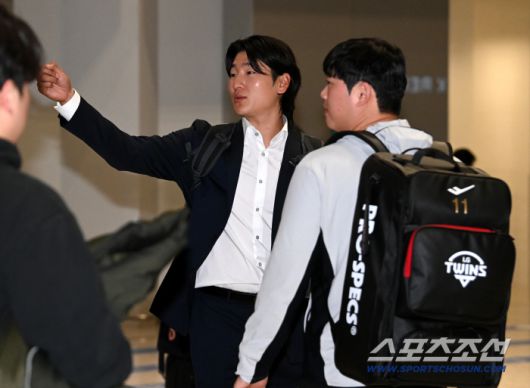두산 베어스 선수단이 23일 인천공항을 통해 전지훈련지인 호주 시드니로 출국했다. 곽빈이 LG 함덕주와 인사를 나누고 있다. 인천공항=허상욱 기자wook@sportschosun.com/2026.01.23/