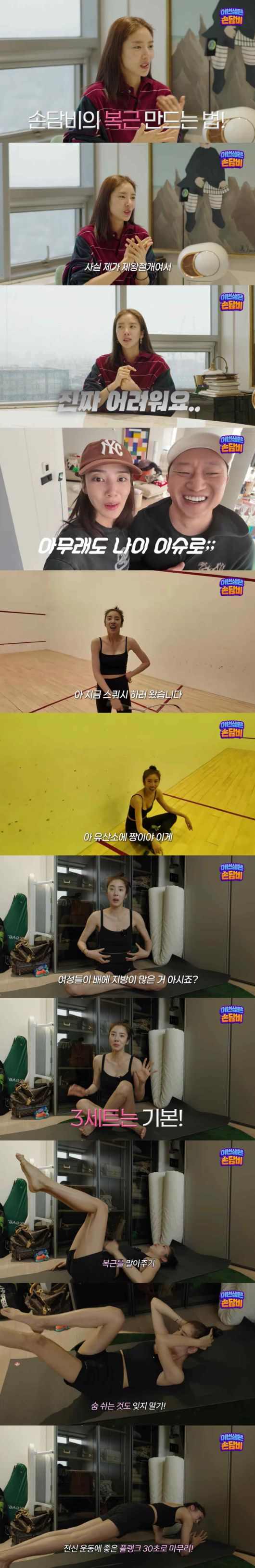 집으로 돌아온 손담비는 요가 매트 위에서 복근 운동을 이어갔다. 그는 "앞에서 스쿼시를 했지 않냐. 복근을 만드는 데는 유산소가 정말 중요하다"며 "여성들은 배에 지방이 많다. 출산 후에는 배가 쪼그라들면서 탄력을 잃고 처지기 쉬운데, 그렇게 되면 복구가 더 힘들어진다"고 설명했다.
