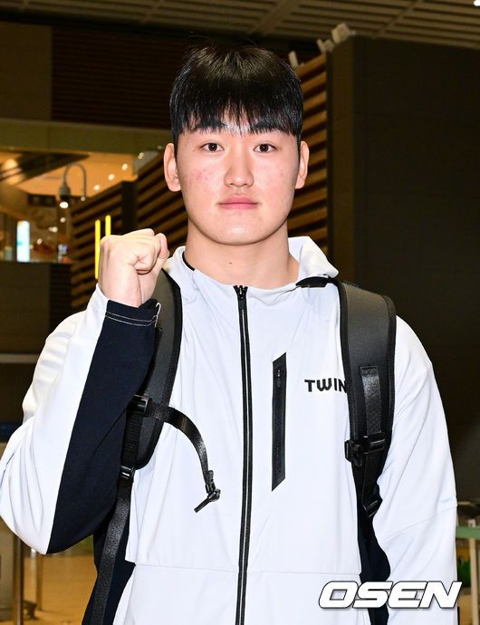 LG 신인 김동현이 출국을 앞두고 포즈를 취하고 있다. 2026.01.23 / dreamer@osen.co.kr