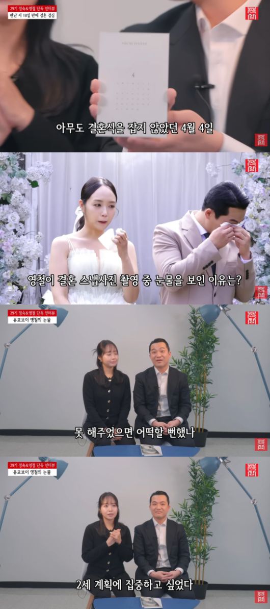 영철은 결혼 스냅사진 촬영 현장에서 돌연 눈물을 보이기도 했다. 이에 대해 영철은 "지금도 스냅 사진을 보면 눈물이 많이 난다. 18일 만에 결혼을 결정해서 이 사람이 뭘 좋아하는지 하나도 몰랐다. 스냅 촬영을 시작될 때 정숙님이 사실 사진 촬영하는 걸 좋아한다고 하더라. 내가 이 사람이 뭘 좋아하는지도 모르고 했구나 알았다. 사실 결혼식을 안 하려고 했다. 혼인신고만 하고 살려고 했는데 촬영을 그때 좋아하는 걸 알게 됐다. 만약 못해줬으면 얼마나 한이 됐을까, 놓쳤다면 얼마나 후회했을까 싶었다. 촬영할수록 (정숙의) 얼굴이 점점 좋아져서 눈물이 많이 났다"고 털어놨다.