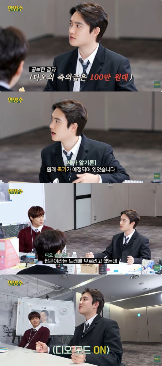 디오는 "100만 원대"라고 고백하며 "원래 축가가 예정돼 있었다. '팝콘'이라는 노래를 부르려 했다"고 밝혔다. 그는 즉석에서 솔로곡 '팝콘'을 감미로운 목소리로 불러 감탄을 자아냈다.