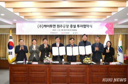 원주시와 강원특별자치도는 22일 오후 시청에서 ㈜케이투앤(대표이사 김병열)과 공장 증설을 위한 투자협약을 체결했다.