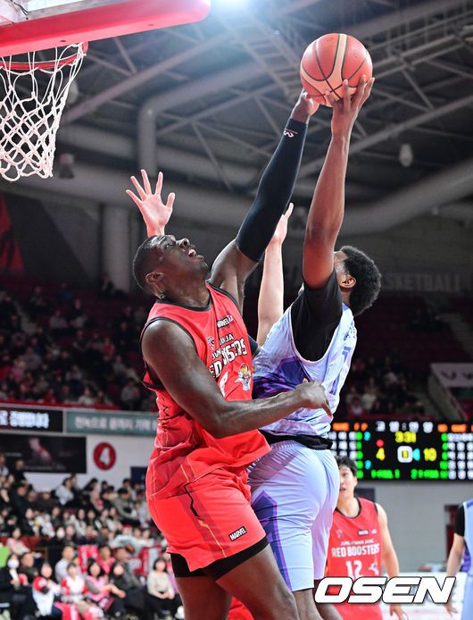 [OSEN=안양, 지형준 기자] 23일 오후 안양 정관장 아레나에서 2025-2026 LG전자 프로농구 안양 정관장과 고양 소노의 경기가 열렸다. 정관장은 2위(22승 11패), 소노는 7위(12승20패)를 기록중이다. 1쿼터 정관장 오브라이언트가 소노 나이트를 슛블록하고 있다. 2026.01.23 /jpnews@osen.co.kr